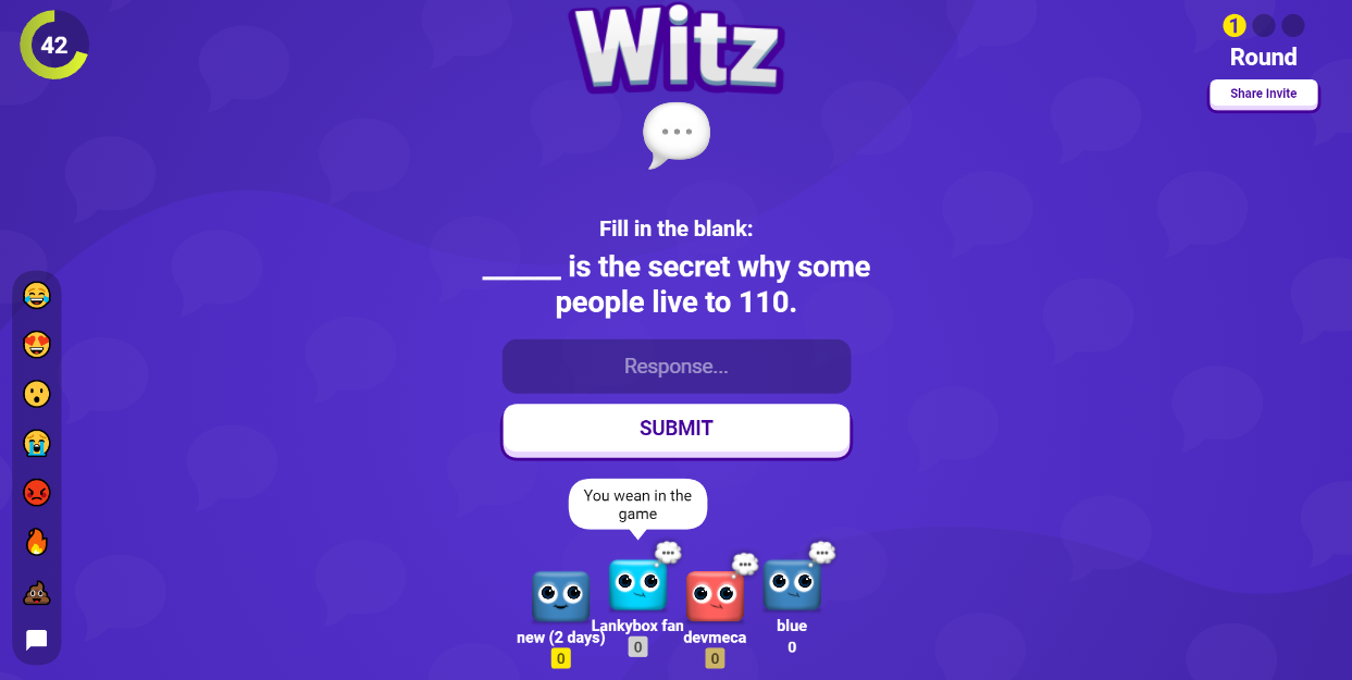 Witz.io is a funny puzzle online game where you will be answering many different questions. It works as follows - the game will put you into a specific group of people, where each gets 2 questions th...