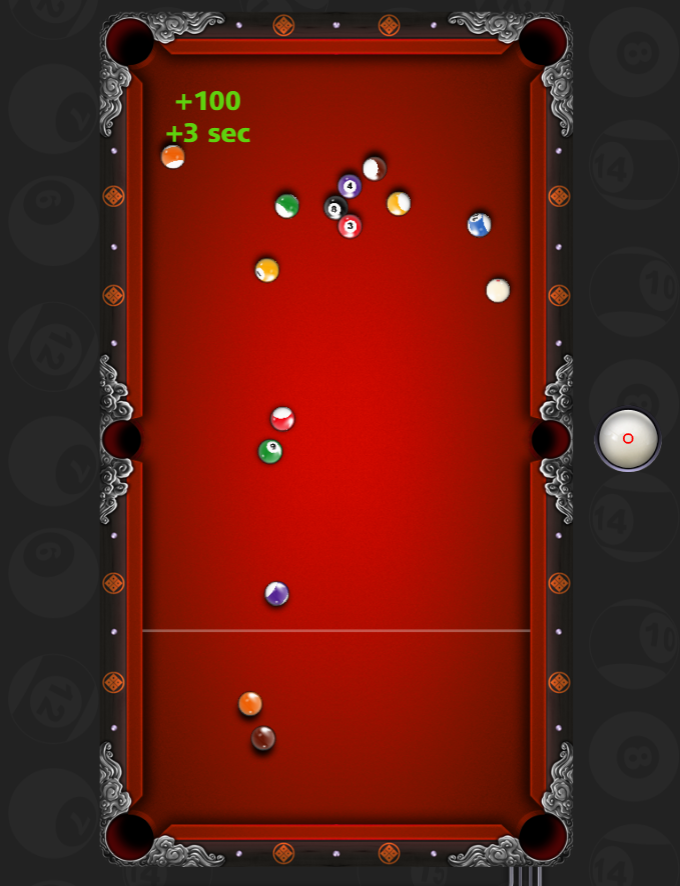 Quickfire Pool for instant play! Pocket as many balls before time runs out in 8 ball billiards. New rack of 14 balls given when you are down to one.