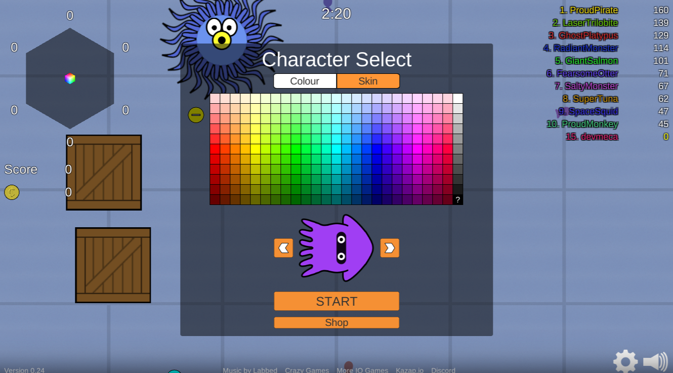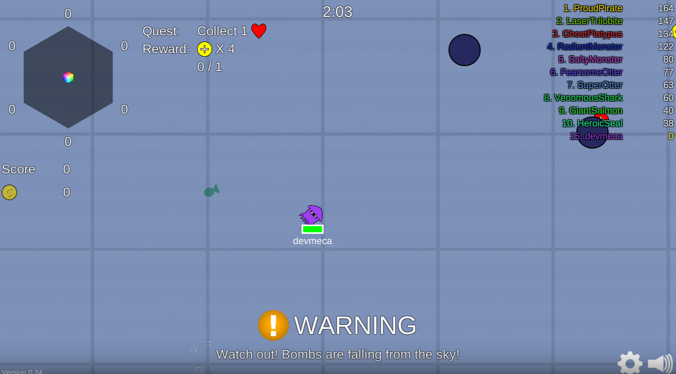 Searide.io is a free iogame. Welcome to the sea, you are in for a dark and stormy ride. We hope you survive or at least have fun. Searide.io is an exciting iogame in the vein of Agario but with a few new mechanics that make it more exciting. First of all, you won't die if you are attacked by a larger opponent. In this game, you have a health bar that you can choose to heal or not. This allows you to take a few shots and also means that you can't expect to just run into someone smaller than you and wipe them out. You're gonna need to do a little bit more work. You can also customize which sea animal you want to be and collect power-ups to help you grow, smash open loot crates for a special ability. Please be sure to avoid the various stationary sea monsters in this game that sit quietly and wait for you to get too close. They can only do harm. Meanwhile, there are power-downs out there which look almost exactly like the power-ups. Don't be fooled into picking those up as they will only slow you down. Use your boost to get in and out of trouble and try to stay alive in this sea-themed arena spectacular.