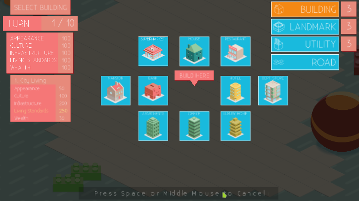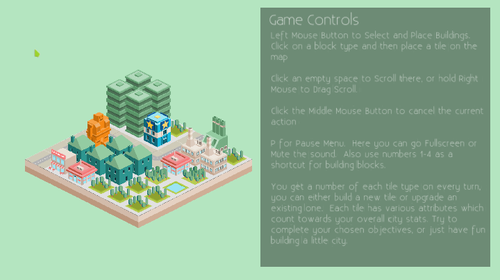 Your goal is to build a prestigious city from many different building blocks. Shops, parks and many other building types are of course included. However, you will have to connect all the buildings with roads. You will have to make great sacrifices to make everyone as happy as possible. Keep an eye on culture, infrastructure and wealth point, since they are all very important.